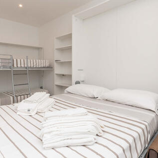 Luminoso appartamento monolocale con ampia finestratura orientata a sud. Dotato di un letto matrimoniale a ribalta di ultima generazione e di un letto a castello a scomparsa.